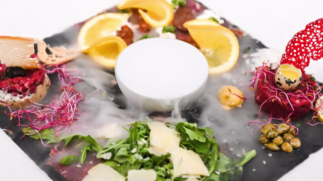 - Carpaccio di filetto, fiocchi di sale nero e senape in grani / carpaccio di filetto, rucola e grana / tartare di filetto e sale rosa himalaya / tartare di filetto e pesto di basilico
