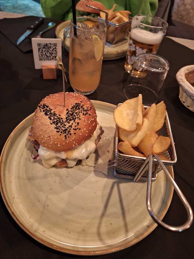 - Pane homemade, doppio hamburger pressato, crema di chorizo, gazpacho fresco, provola, cipolla croccante