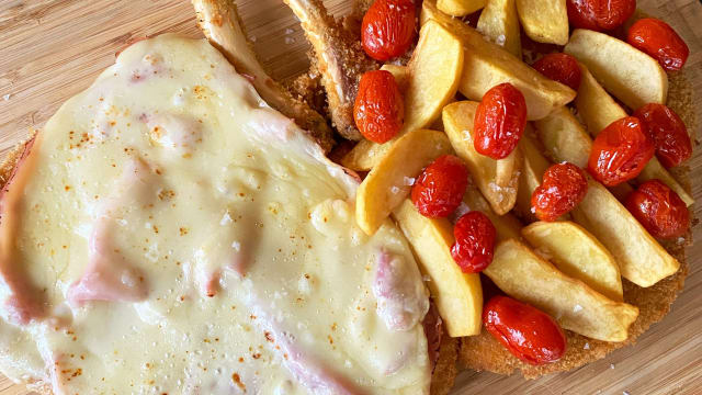 Doppia costoletta di vitello cotta nel burro chiarificato alpino, prosciutto cotto, fontina e patate fritte