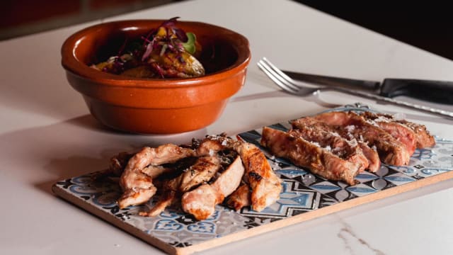 - Solomillo de ternera, lomo bajo y entraña con guarnición.