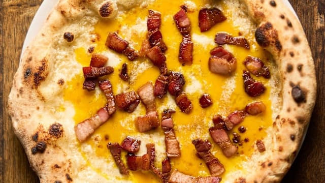 - Passata di pomodoro, mozzarella fiordilatte, pancetta, porcini, rucola, parmigiano, basilico e olio EVO
