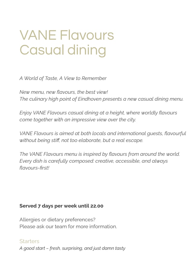 Whether you are from Eindhoven or just visiting the city for the day, VANE Skybar is the Skybar of Eindhoven not to be missed. Sit down and relax while sipping some of the best cocktails, inspired by the four wind directions of a weathervane and enjoy the views of Eindhoven city centre from the pinn...
