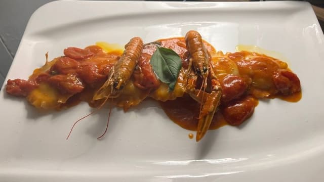 Ravioli ripieni di ricotta e grana con sugo agli scampi