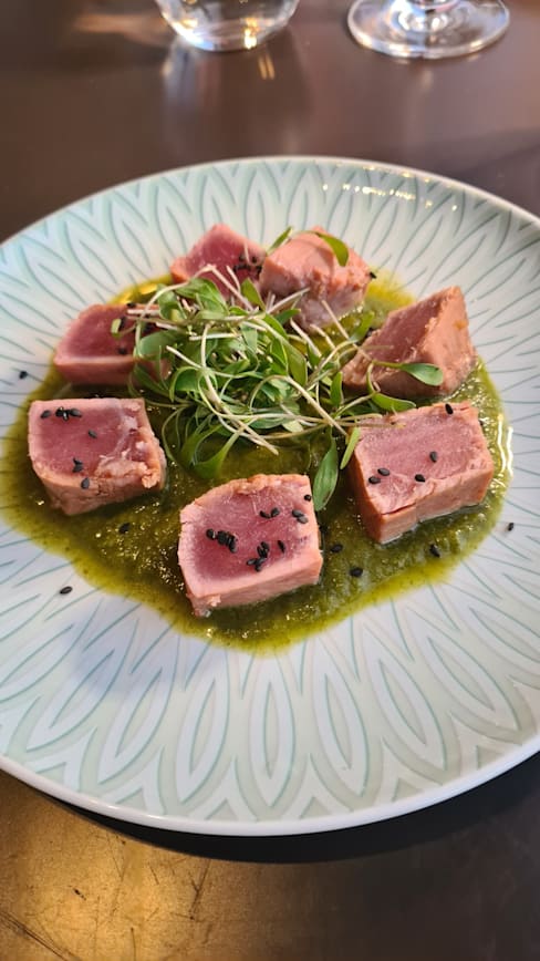 10/10The food was very good. We had soy-marinated tuna and braised scallops as a starter. Shrimp curry scented with mango and grilled sirloin steak as Main. The dessert was sorbet and Creme brulee. I will recommend this restaurant. Start with a glass at the roof top bar with fantastisc view over the City.