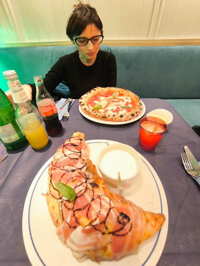 - Calzone in crosta di pecorino romano, provola dei monti lattari, pesto di pistacchi di bronte, Mortadella i.g.p. di bologna.