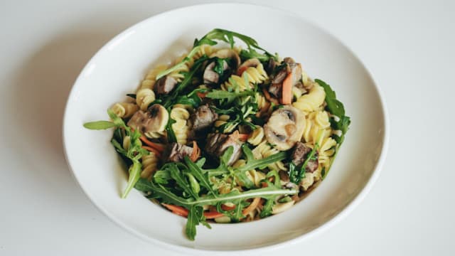 filet de boeuf tendre, champignons et légumes frais avec du vin blanc et de la roquette