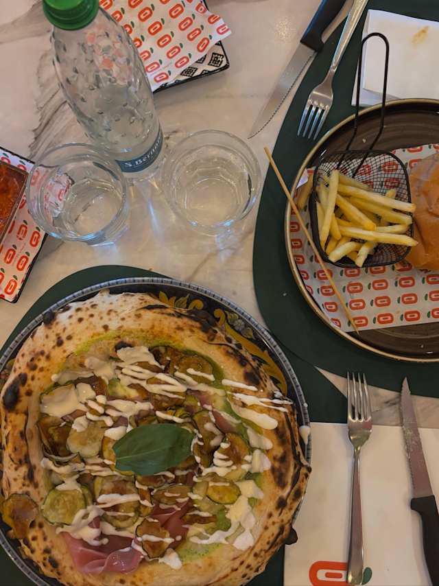 - Pomodoro san marzano, fiordilatte, funghi, carciofi, salame, in uscita prosciutto cotto arrosto polvere di olive nere, basilico e olio evo