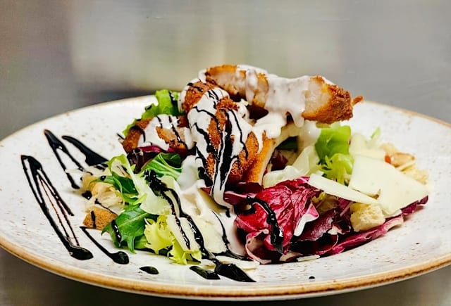 Pechuga de pollo a la plancha con verduras, patatas fritas y salsa casera.
