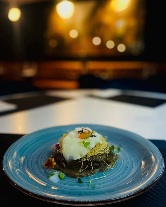 Arrilleras de ternera cremosas con emulsión de champiñones, huevos de corral y trufa negra sobre un nido de kataifi con patatas cocidas.