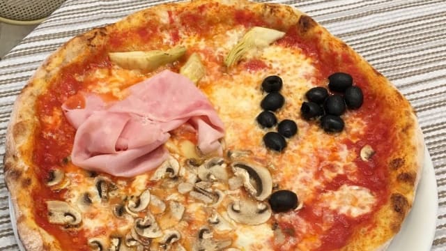 Pomodoro con mozzarella fiordilatte, funghi champignon, carciofi, olive nere e prosciutto cotto.