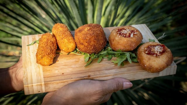 Fior di latte di agerola, prosciutto cotto, crocchè di patate, pepe, olio EVO e basilico