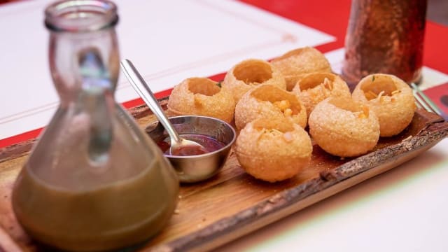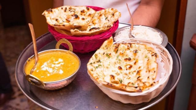 Entrants: samosa, veg. pakora, panner tikka, veg. kebab, pa formatge. Segon: dhal makhani, bhindi baji, paneer kolhapuri, arros pilaw, garlic nan, postres i té chai