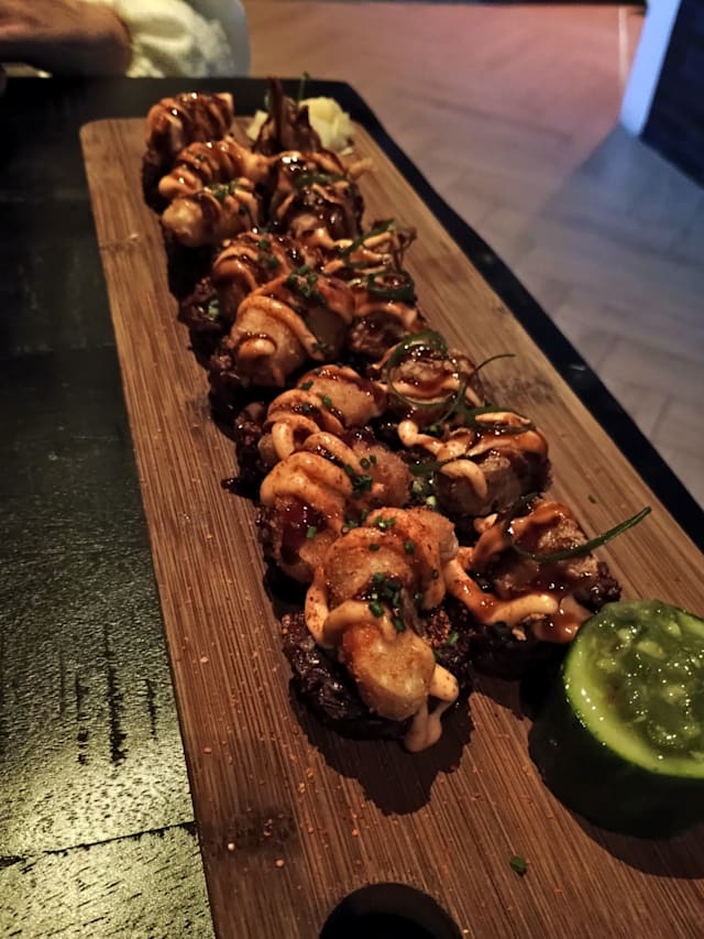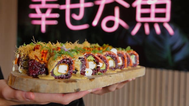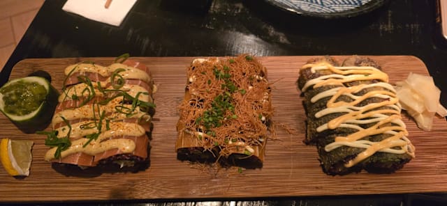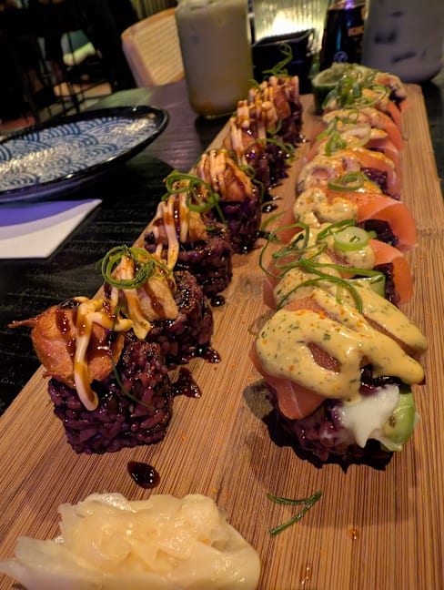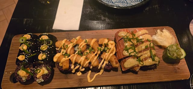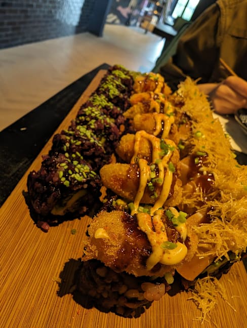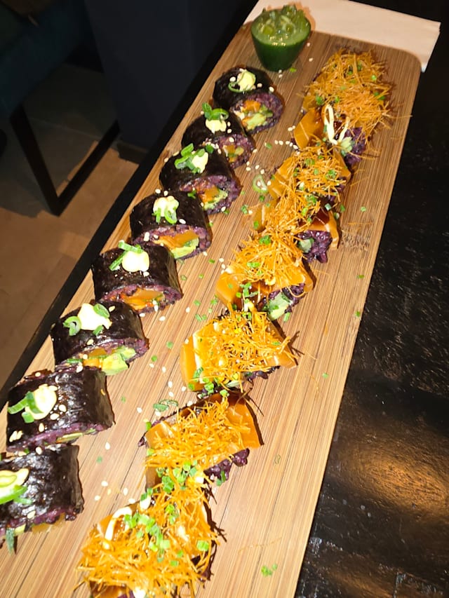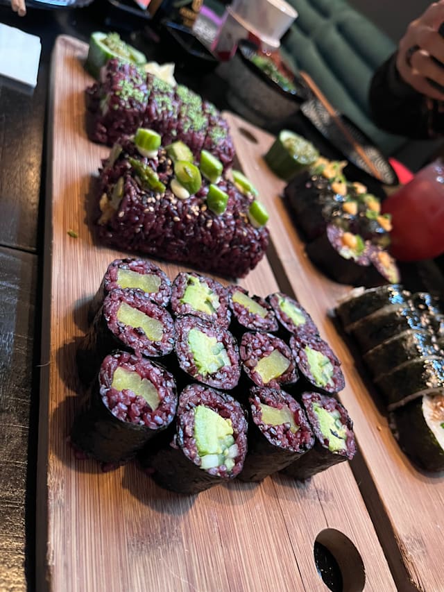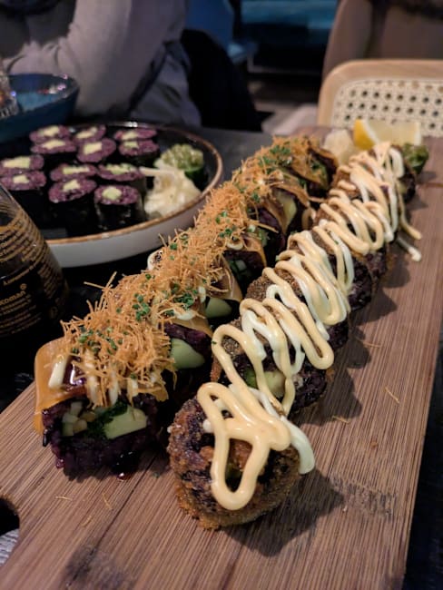 9.5/10+2The sushi is delicious - very colourful and the flavours match very well. Absolutely top-notch sushi rolls - you wouldn't guess it's vegan as it tastes and looks like regular sushi. Very authentic taste...and also very photogenic. I highly recommend the food. Though we were the first to arrive (admittedly we did arrive quite early), the restaurant was soon (almost) fully occupied. Very friendly and welcoming staff too, they served us with a smile and were happy to answer any questions we had. The food is definitely well worth the money, and to eat sushi of this calibre is quite unique. Though many people here are used to the AYCE-concept, the prices could seem rather expensive. Yet considering the quality of the dishes and the dining experience, it's definitely not overpriced. I'm also waiting for an extension of the dessert menu - I came for the sushi, but having only two dessert options seems a bit limited. I hope to come back again soon. Innovative, a treat for mouth and eyes!