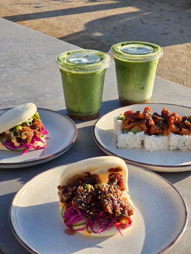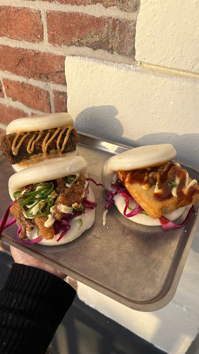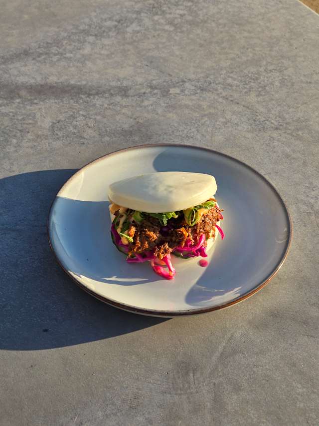 - Tofu katsu, cucumber, pickled red cabbage, okonomi sauce, mayo, mustard, white sesame.