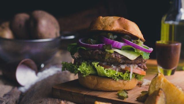 A beyond-meat patty on a brioche bun loaded with lettuce, tomato, pickles and our homemade burger sauce