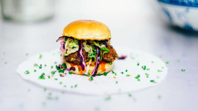 A chicken patty on a vegan brioche bun loaded with lettuce, tomato, caramalized onion, cheese and BBQ.