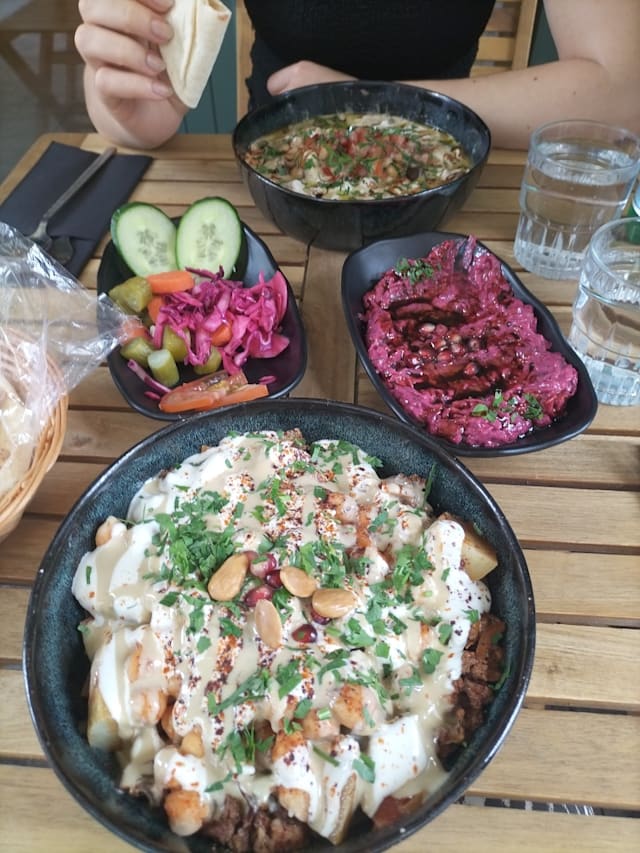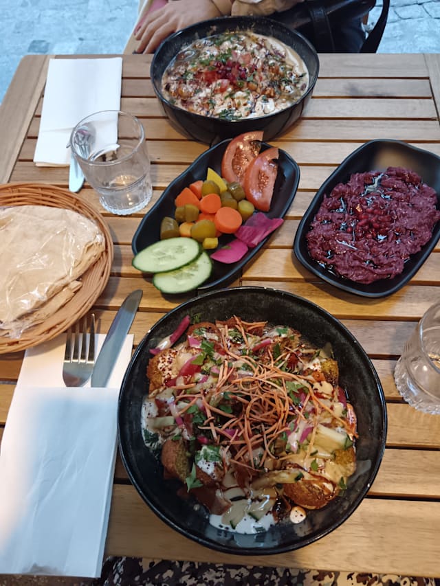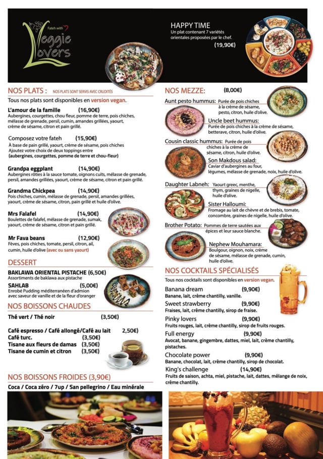 5/10Nice location on a side street in Le Marais district. However for a vegetarian restaurant the quality of the food was disappointing. The lady serving the food was nice, but the falafel were dry??? (how can you screw up falafels at a vegetarian restaurant serving Lebanese/Mediterranean food). The food was lacking any flavoring and when I asked if we can get some food from the next door Shawarma lover restaurant (which is owned by the same people), we were told our reservation was for Veggie Lovers, so no!!! Total disappointment, and the two stars were for the server who was very polite.