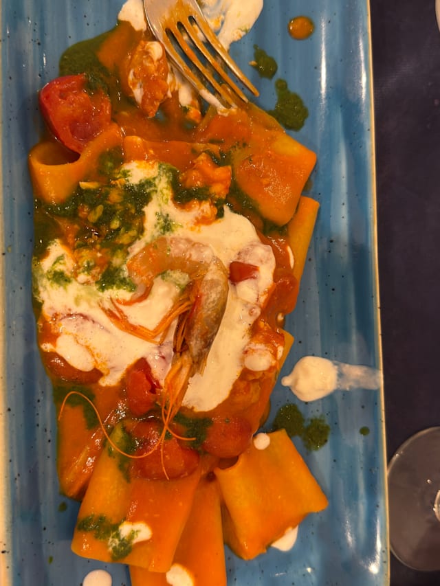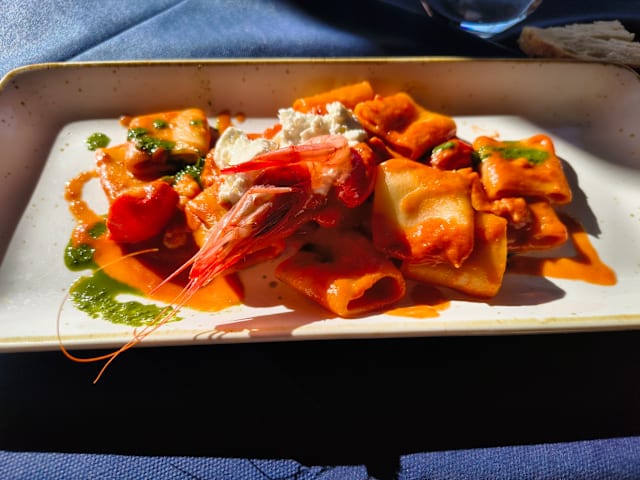 Pacchero imperiale con pomodori pachino, stracciatella di bufala e gambero rosso di sicilia