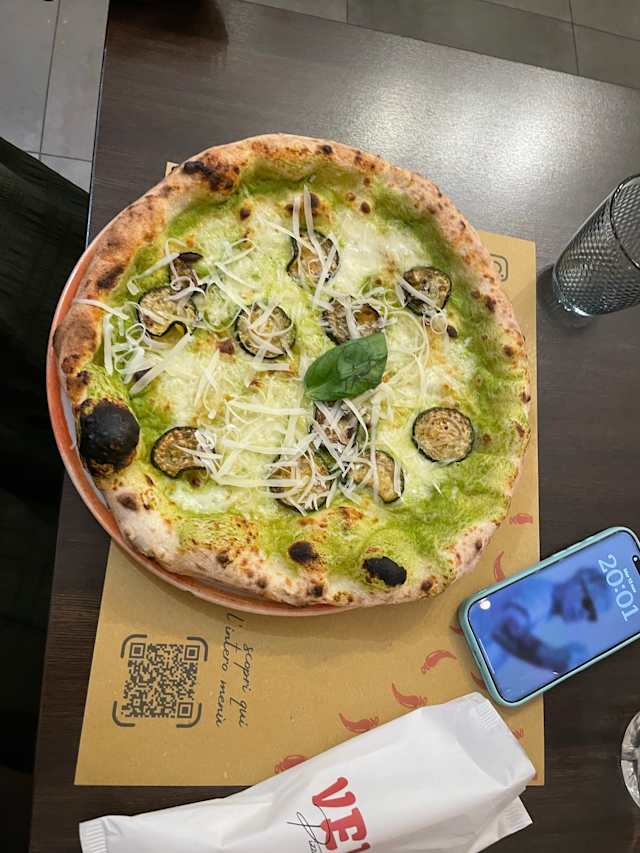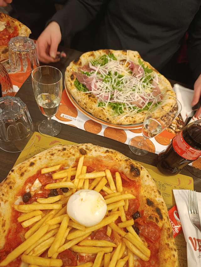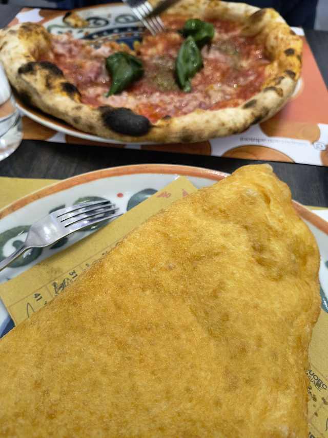 - Pizza doppia cottura, prima fritta e poi ripassata al forno pomodoro, ricotta di bufala, pepe nero, scaglie di grana e foglie di basilico