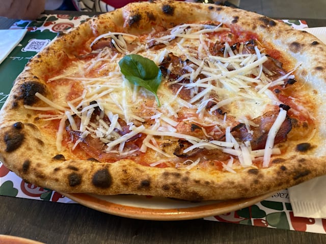 fior di latte campano,guanciale,tuorlo d'uovo pecorino romano,pepe e basilico