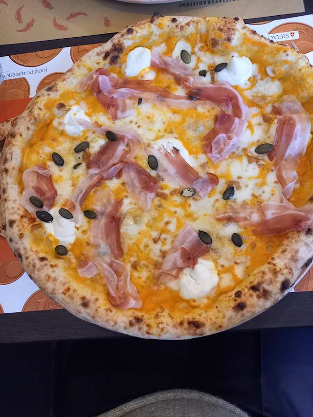 - Fiordilatte campano, in uscita rucola, prosciutto crudo, funghi Pleurotus grigliati sottolio e olio al tartufo