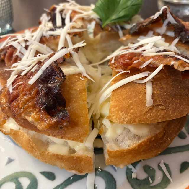 - Provola dei Monti, porchetta, patate al forno con rosmarino e foglie di basilico