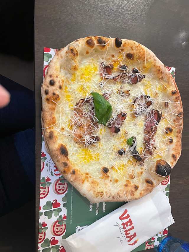 - fior di latte campano,guanciale,tuorlo d'uovo pecorino romano,pepe e basilico
