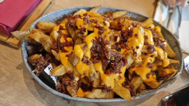 Huevos rotos servidos sobre patatas fritas, a menudo con jamón.