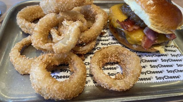 Anillos de calamares fritos, crujientes por fuera y tiernos por dentro.