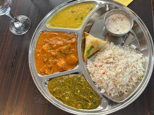 - Entrée + plat végétarien ou viande en sauce + riz + naan fromage + dessert