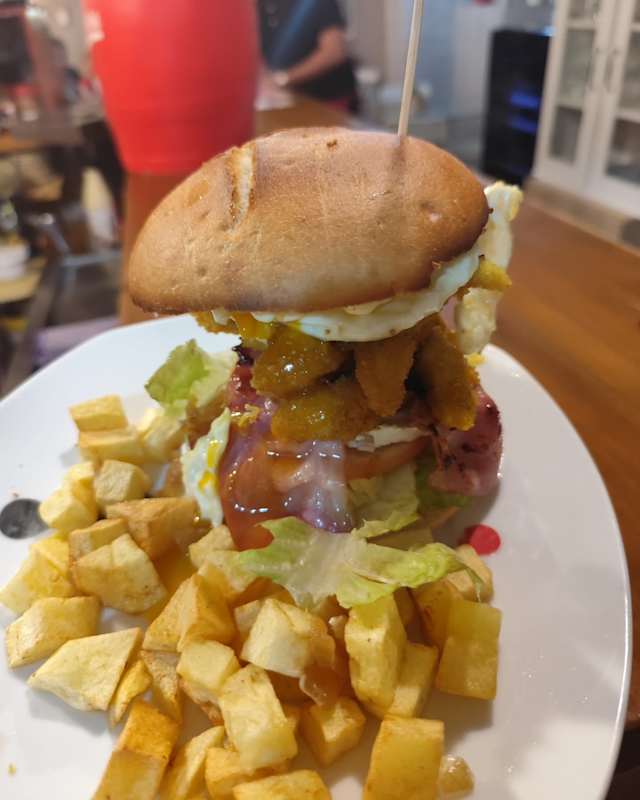 - Pa, hamburguesa de vedella, enciam, tomaquet, formatge, bacó, ceba, ou ferrat i acompanyada de patates