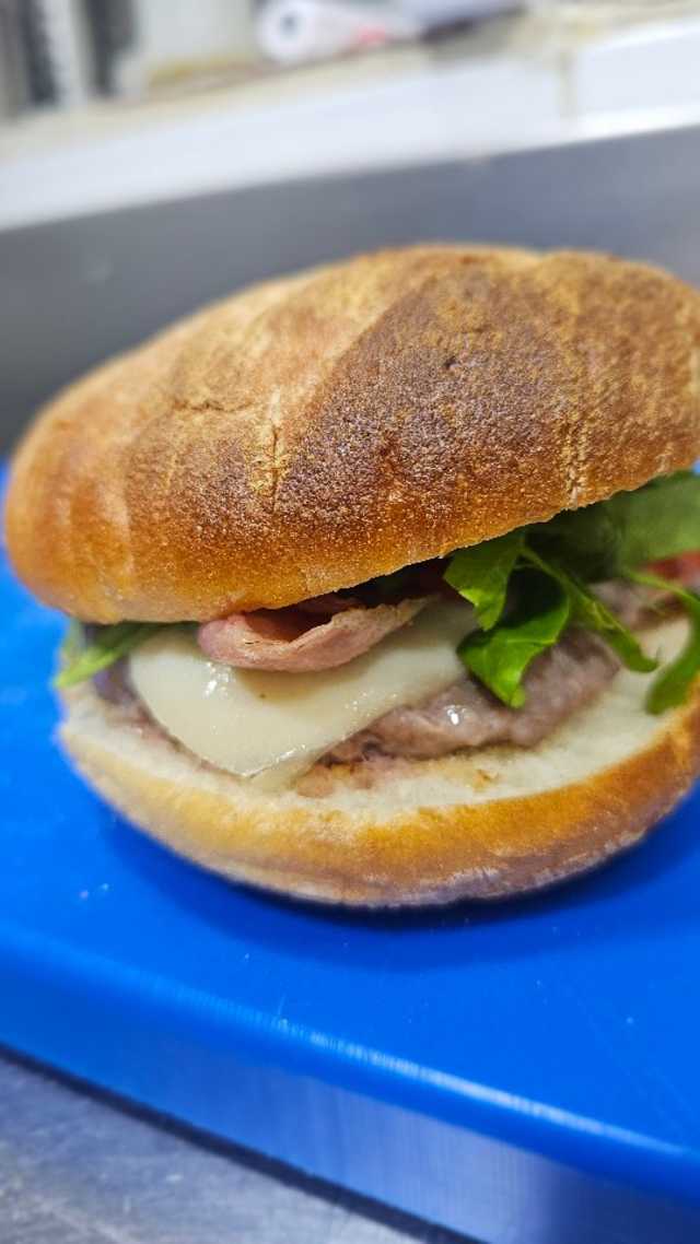 - Pa, hamburguesa de pollastre, enciam, tomàquet, formatge, bacó, ceba, ou ferrat, maionesa i acompanyada de patates