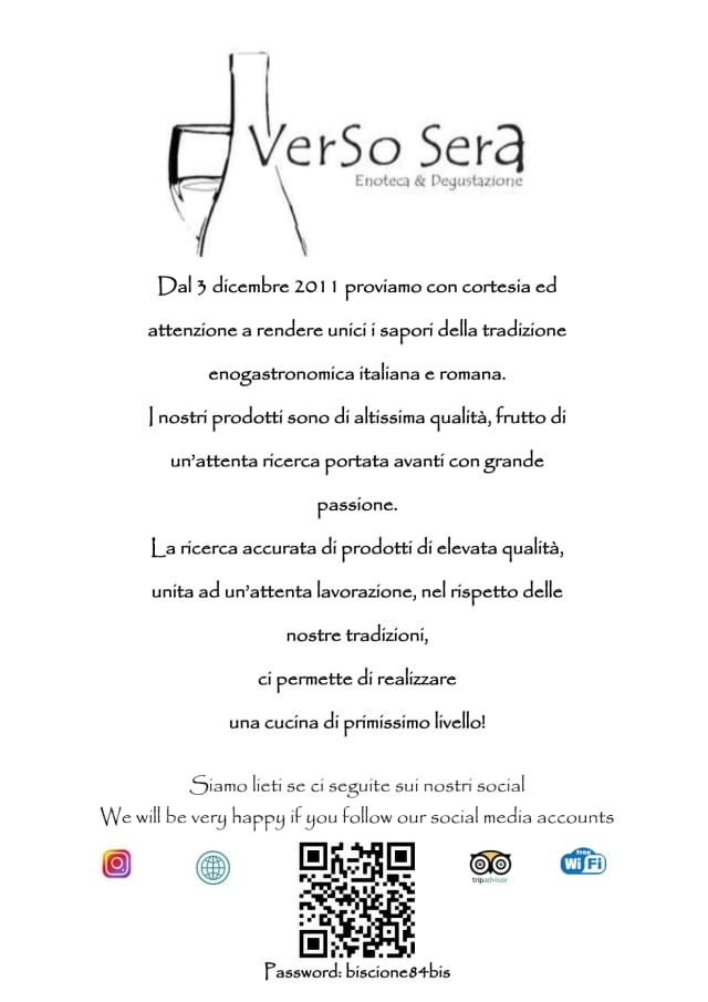 10/10We chose Verso Sera initially because we wanted a restaurant close to our lodgings, but not directly on Campo de Fiori. We were able to make a reservation on short notice for our group of five. What a great choice it turned out to be. The food was excellent, servers were friendly and helpful with food and wine choices and the outside patio was warm and cozy, even when it was raining. We went back for our final meal in Tome!