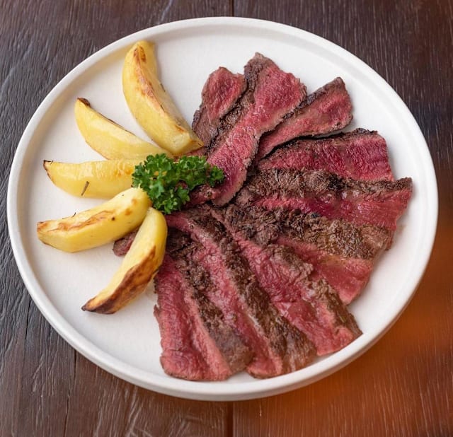 Cotto a bassa temperatura, salsa chimichurri, cipolla rossa di Tropea in agrodolce