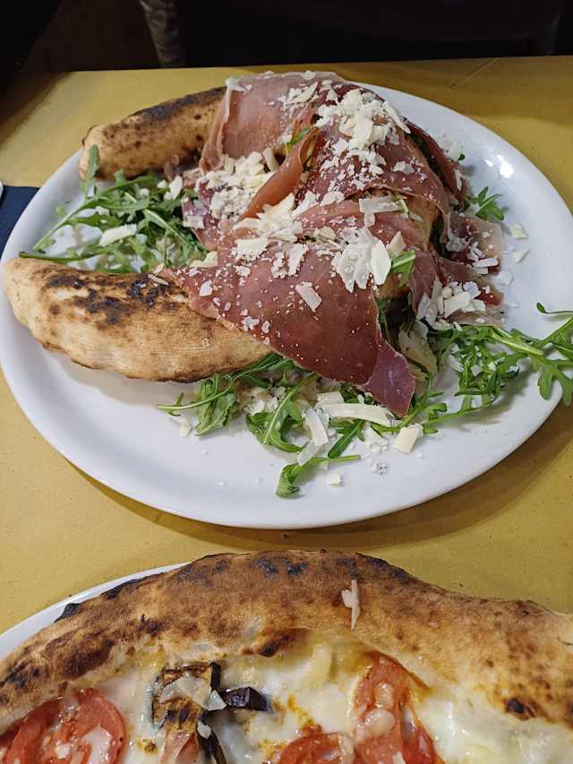 - Calzone al forno ripieno di provola di Agerola e mozzarella, servito con prosciutto crudo, rucola fresca e scaglie di grana. Un connubio di sapori autentici che unisce la cremosità del ripieno alla freschezza e alla sapidità del contorno.