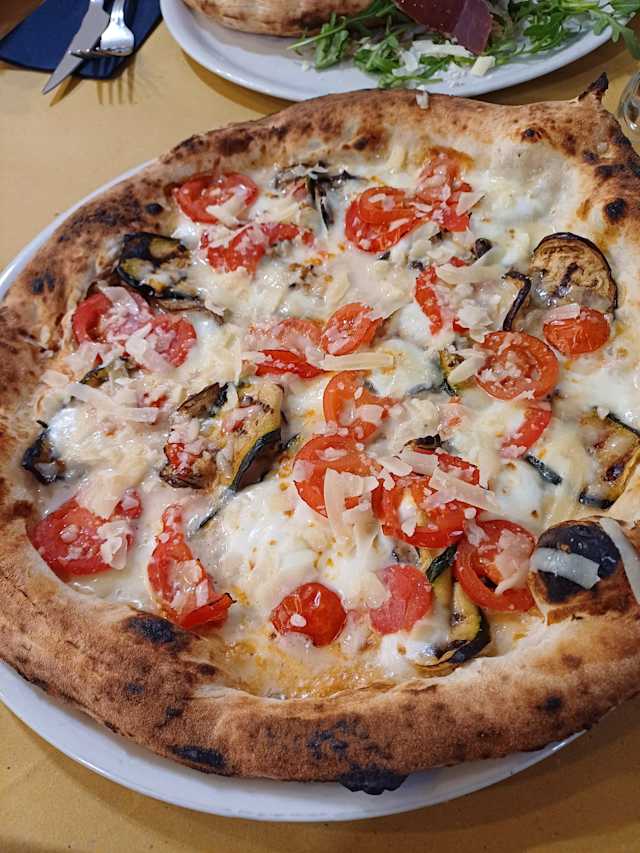 - Pomodoro, mozzarella, parmigiana di melanzane una pizza succulenta con pomodoro, mozzarella e parmigiana di melanzane. Un mix di sapori mediterranei che si fondono armoniosamente sulla tua pizza preferita.