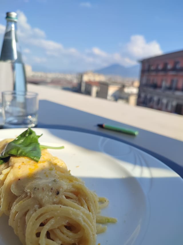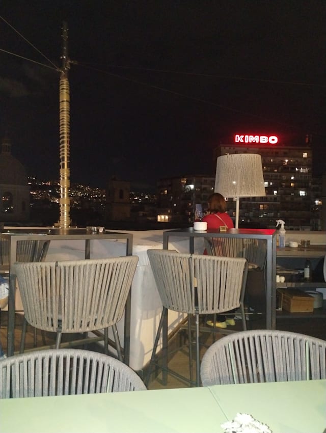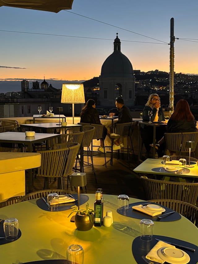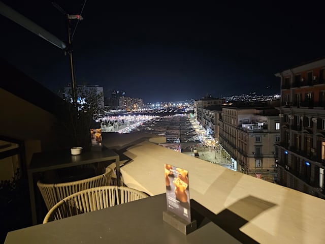 9/10Without doubt , it’s an outside table you want on a nice day … nice suprize on rooftop in the middle of the gritty part of the city close (300m ) to the Naples central train statio n in the main square ( piazza garibaldi ) … almost always open at anytime , as the restaurant is part of a 4 star hotel ….. speaking of stars , the star here is manager FRANCESCO … old school polite , courteous , authentic , genuine , friendly & is the way all hospitality peoples can take as an example … He will do his best , so you may have a joyous memorable experience , ( & with pleasure ) … no one could ask for more than that (?) !