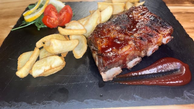 Pane artigianale, hamburger di di manzo 200gr., cheddar, lattuga, pulled pork, cipolla caramellata, salsa BBQ, maionese