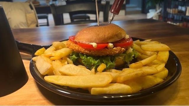 Pane artigianale, hamburger di pecora 150gr., rucola, ventricina croccante, zucchine e melanzane grigliate, provola affumicata, fonduta di pecorino, medaglione di peperoni e uova