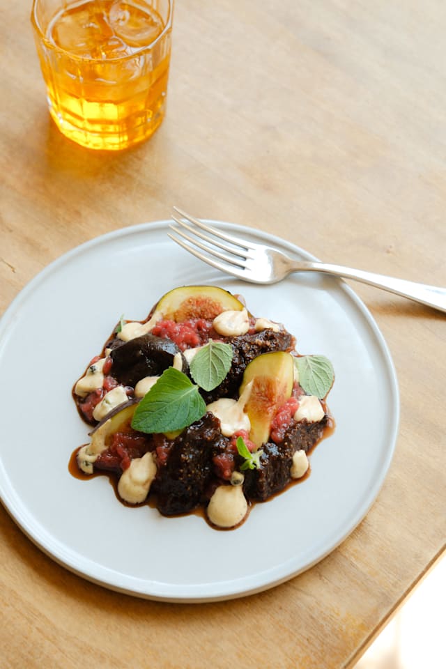 Battuta di pecora, fichi, mosto cotto, pepe verde