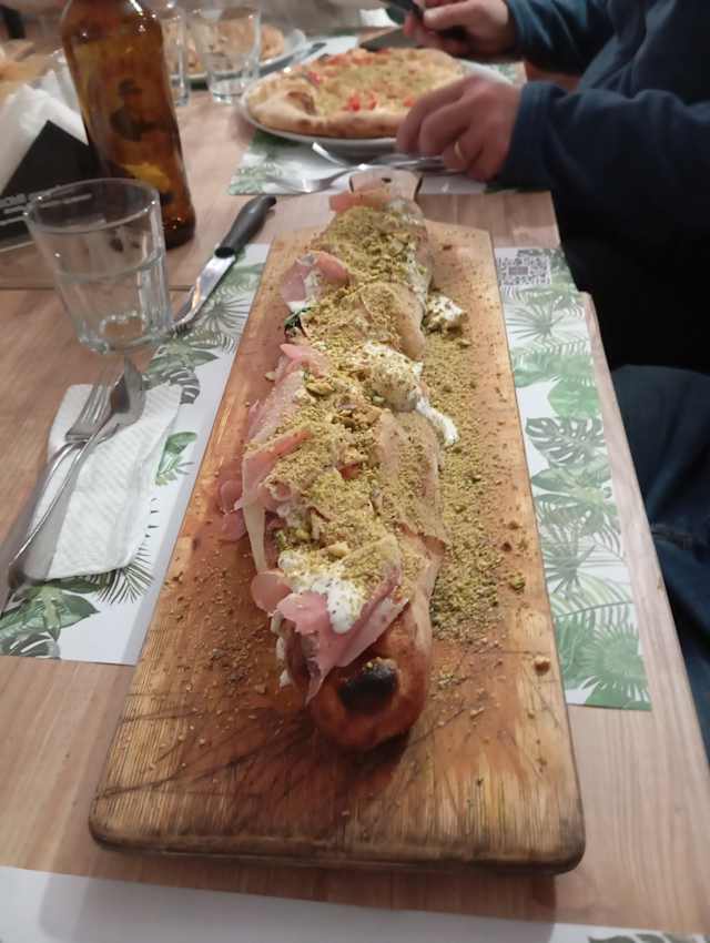 - Pizza arrotolata con speck, mortadella, fiordilatte, salsiccia, curcuma, pistacchio, salame piccante e pecorino