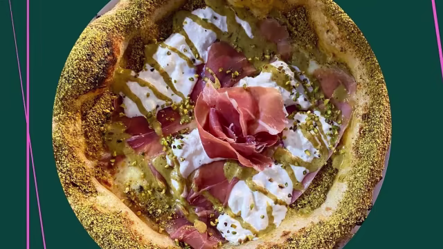 - Vellutata di datterino giallo,, fior di latte “latteria sorrentina”, stracciatella latteria sorrentina, prosciutto crudo di parma, pesto di pistacchio, granella di pistacchio e cornicione in crosta di pistacchio