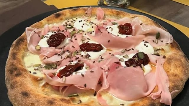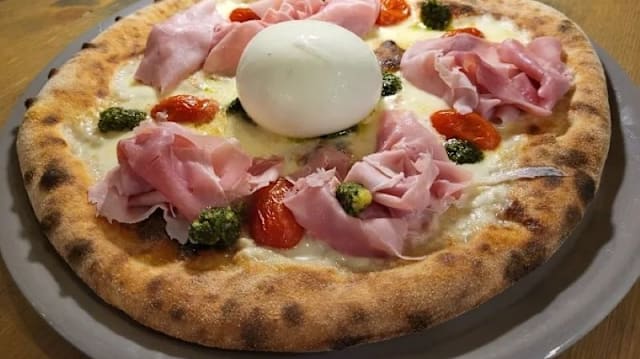 Pomodoro, fior di latte fresco, funghi, carciofi, olive toscane, cotto alta qualità.