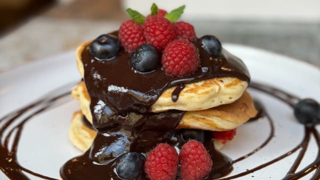 - Pancakes con topping de nutella, frutos rojos y toppings