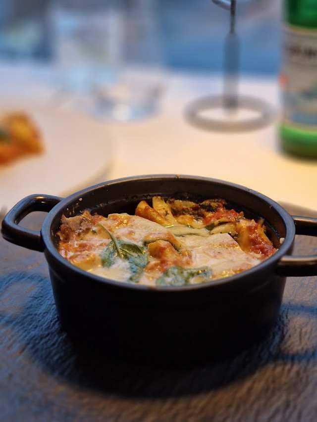 - Spinach, mushrooms, zucchini, eggplant, basil, béchamel sauce, tomato sauce, mozzarella, parmesan
