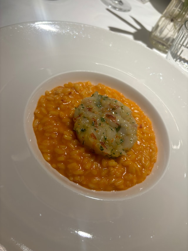 Riso riserva san massimo, aglio nero, olio, peperoncino con battuta di gamberi