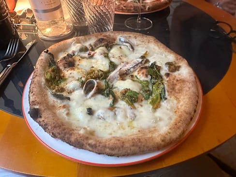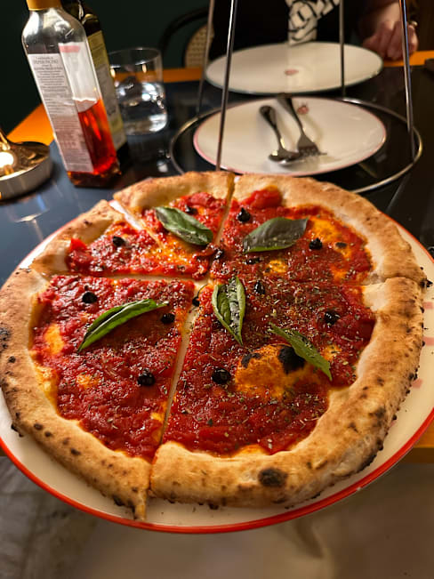 10/10Authentic interior, truly Neapolitan pizza on the thin crust (and a large selection of feelings!). Tomato salad with arugula is not worth attention—only cherry tomatoes were tasty, and the arugula was not appropriately washed—sand crunched on teeth. Polite service. Very politely, with questions and body language, waiters hinted that it was time for us to leave as soon as we finished with pizza, ordered an espresso and did not plan to order more. But for the pizza, it is worth coming back here!