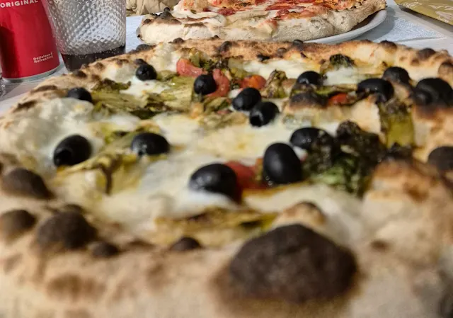 - Pomodoro, fior di latte, funghi champignon, carciofini, olive e prosciutto cotto