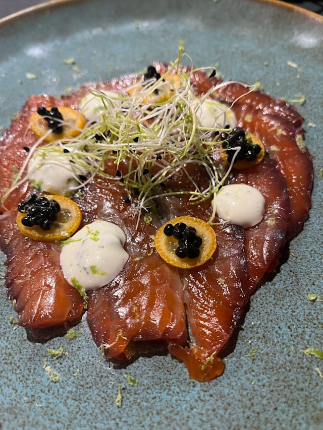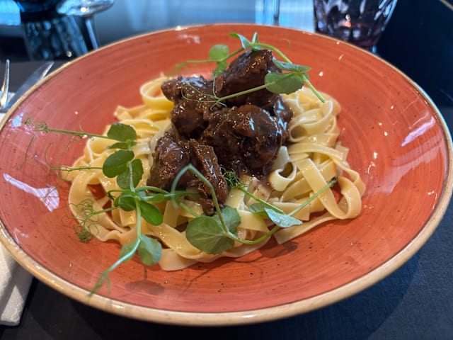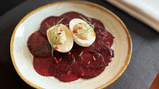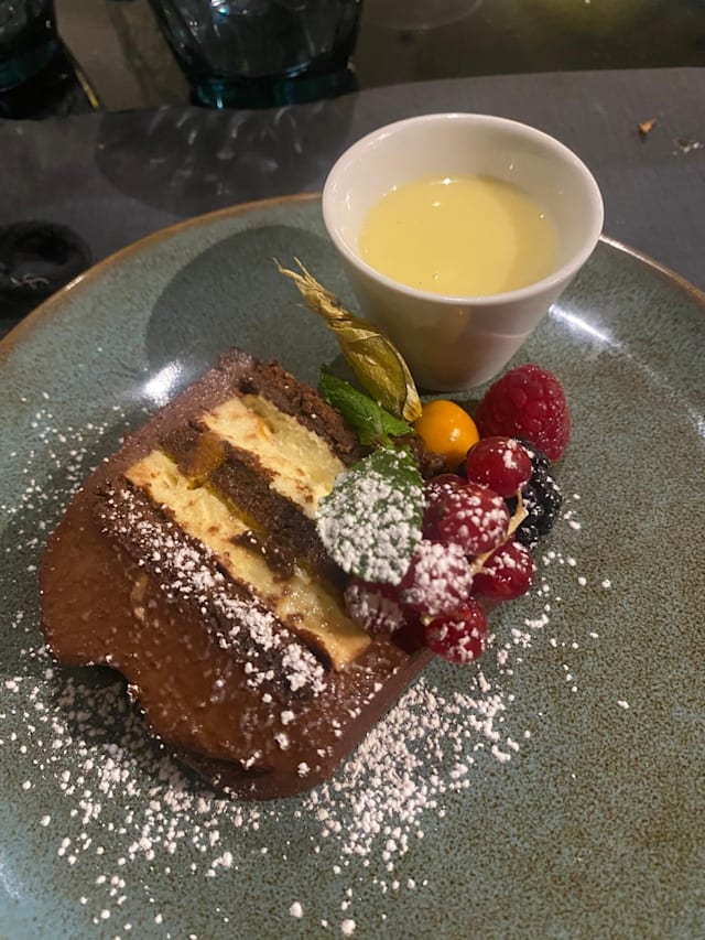 5.5/10The ambience in the restaurant was quite good. The lights could have been dimmed a little bit more. The food was not very good. Both the salmon in the starter and the meat in the main course were of low quality. The meat in the entrecote had way too much fat. In fact, the fatty parts made up almost 50% or more of the entrecote. I would have hoped that the restaurant would have served pure fillet made out of tenderloin, without any fatty parts. Otherwise, the restaurant should offer burgers or other safe choices, as large part of the menu is a little bit too arty farty for my taste.