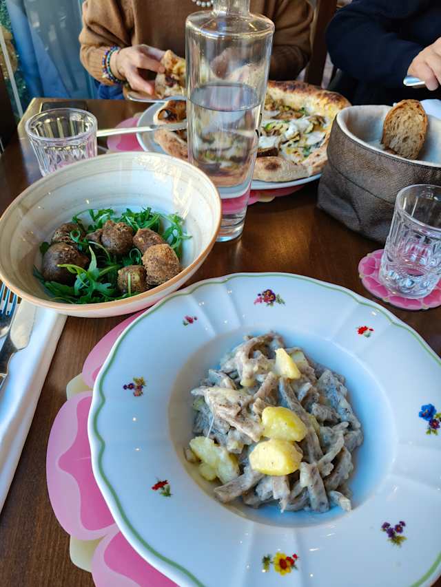 - Crema di tartufo nero, fior di latte, salsiccia di maialino, scaglie di tartufo fresco e olio evo